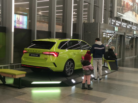 Машина шкода в аэропорту в Праге и дети, играющие с новой машиной
